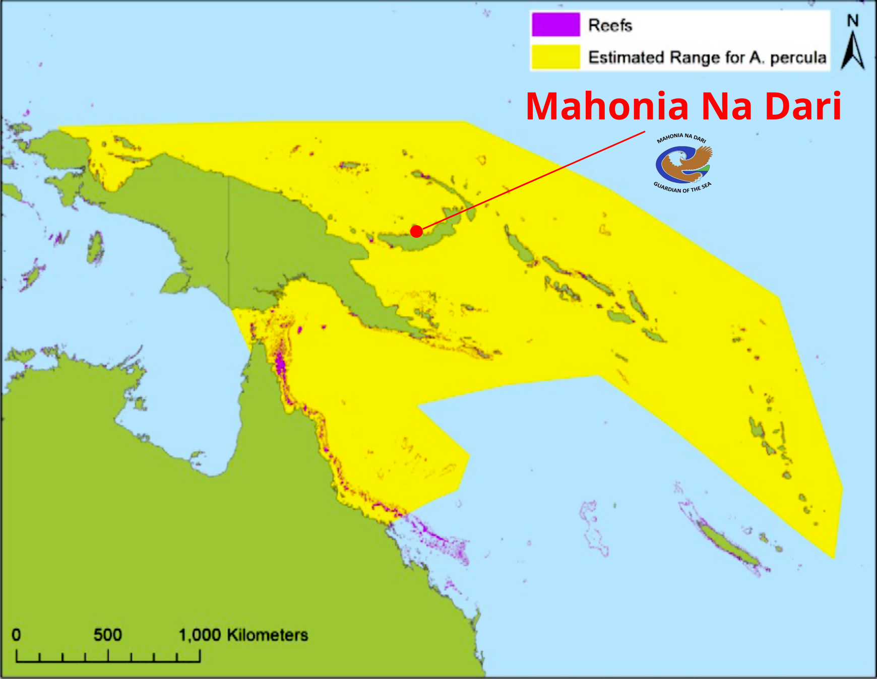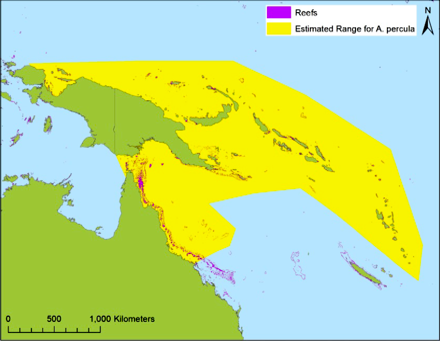Range map of A. percula; taken from NOAA 2016; Timm et al. 2008, and De Brauwer 2014, also showing coral reef areas from Burke et al. 2011