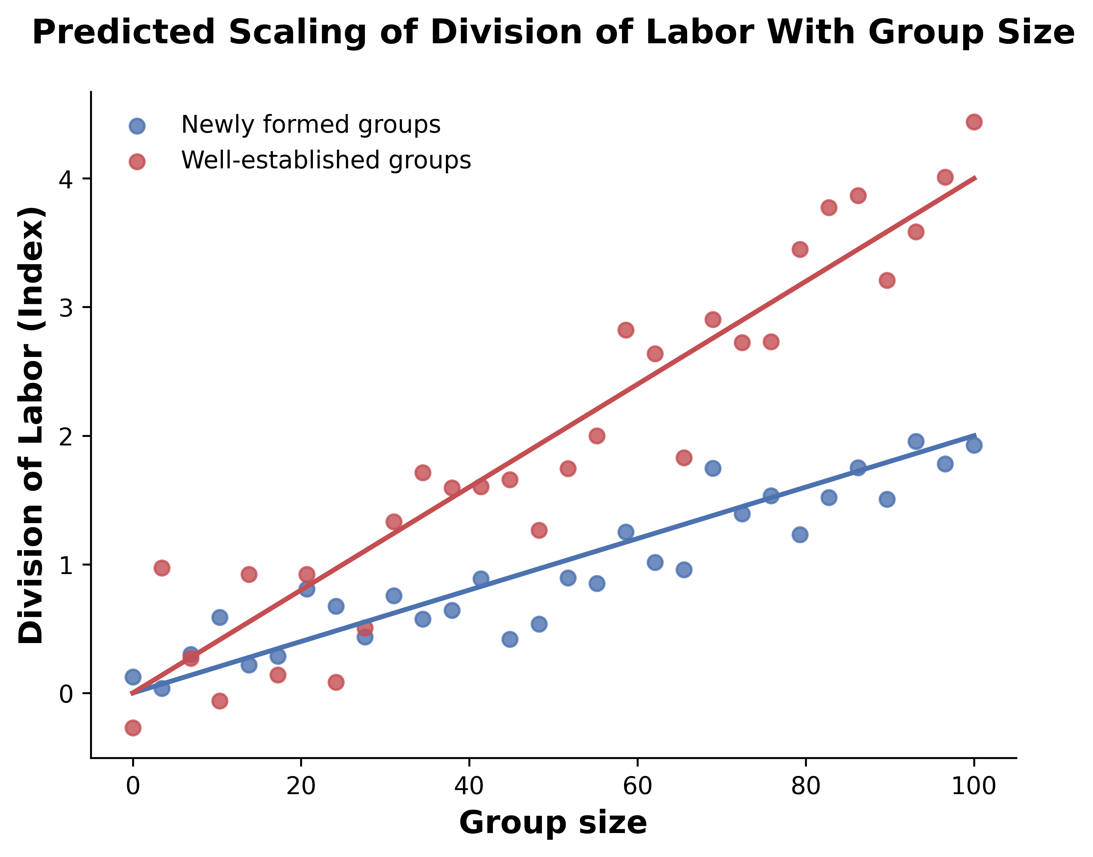 - Hypothesis: The degree of division of labor increases with group size in established social groups.
